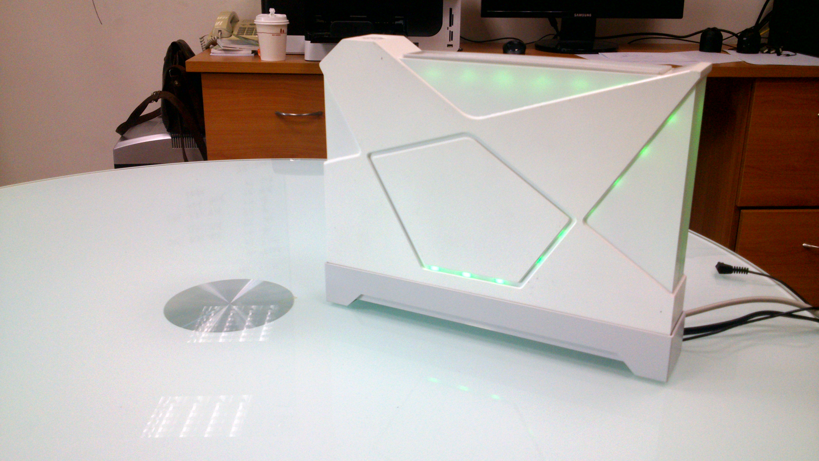 當偵測到聊天的聲調和頻率時,「Voice Care聲聲呼喚」分機(中)會閃現溫和綠光,若偵測到呼叫聲則會立即連線主體機(電腦或雲端伺服器),並撥打電話。